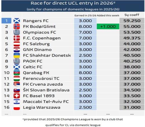 但挪威超級聯(lián)賽冠軍直通歐冠的名額僅適用于博德閃耀。即使維京或莫爾德贏得了聯(lián)賽冠軍,他們?nèi)匀恍枰獏⒓淤Y格賽,因為截至目前為止,他們的有關(guān)系數(shù)要低得多。目前博德閃耀在少賽一輪的情況下,落后榜首的維京1分。