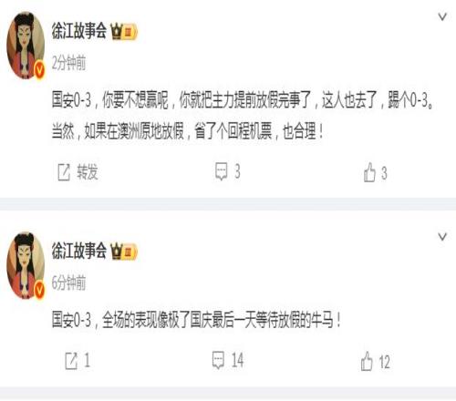 媒體人徐江用一個(gè)形象的比喻來點(diǎn)評(píng)這場(chǎng)比賽,“國(guó)安0-3,全場(chǎng)的表現(xiàn)像極了國(guó)慶最后一天等待放假的牛馬!你要不想贏呢,你就把主力提前放假完事了,這人也去了,踢個(gè)0-3。當(dāng)然,如果在澳洲原地放假,省了個(gè)回程機(jī)票,也合理! ???”