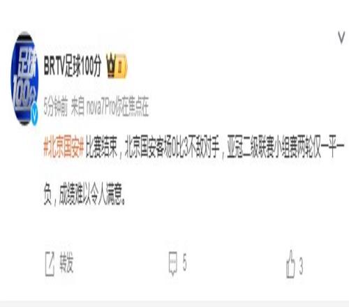 而北京媒體《足球100分》欄目,也直言不諱指出球隊(duì)表現(xiàn)無法令人滿意,“比賽結(jié)束,北京國(guó)安客場(chǎng)0比3不敵對(duì)手,亞冠二級(jí)聯(lián)賽小組賽兩輪僅一平一負(fù),成績(jī)難以令人滿意。 ?”