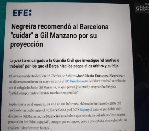 針對(duì)主裁判曼薩諾,皇馬電臺(tái)還公開曬出了此前內(nèi)格雷拉案的一份法庭報(bào)告,指出曼薩諾有傾向巴薩的嫌疑。在這份法庭報(bào)告中,前裁判技術(shù)委員會(huì)副主席內(nèi)格雷拉承認(rèn)自己收了巴薩的錢,并向巴薩提出建議,希望他們和曼薩諾搞好關(guān)系。