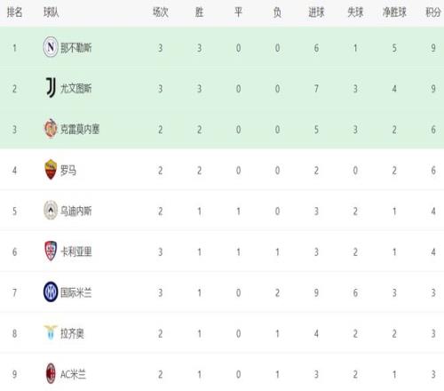 在積分榜上,3戰(zhàn)全勝拿到9分的那不勒斯排名榜首。尤文圖斯也是9分,但凈勝球少一點(diǎn),只能排名第2??死啄獌?nèi)塞2戰(zhàn)皆勝,拿到6分排名第3。羅馬也是6分,排名第4。烏迪內(nèi)斯和卡利亞里拿到4分。而國際米蘭3場2負(fù),只拿到3分,排名第7!