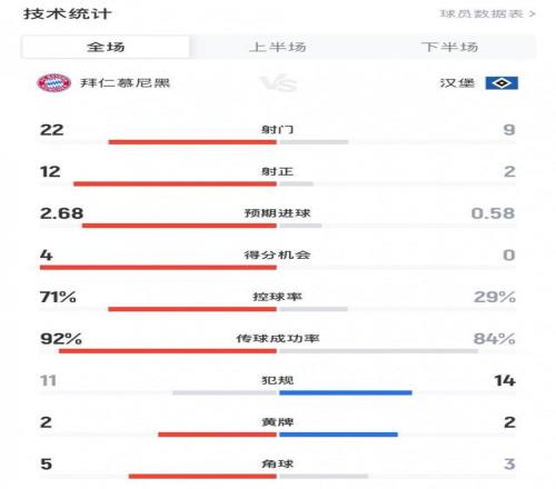 直播吧9月14日訊 德甲第3輪,拜仁主場(chǎng)5-0擊敗漢堡,兩隊(duì)全場(chǎng)比賽數(shù)據(jù)如下(主隊(duì)拜仁在前):