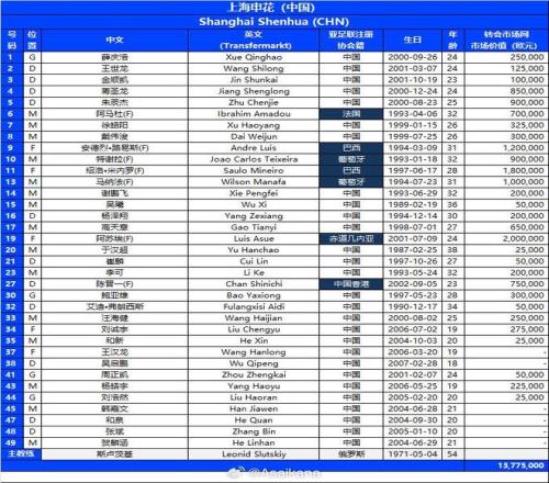 上海申花亞冠名單: